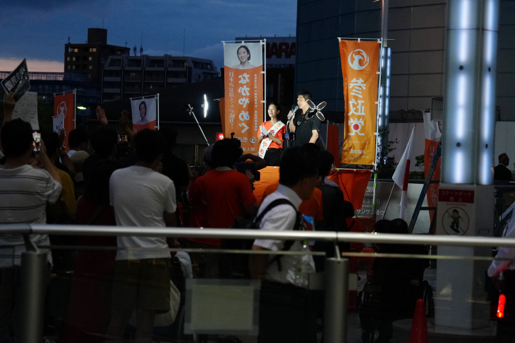 7月13日,日本参政党党首神谷宗币(中右)在千叶县参加街头演说活动。图据新华社