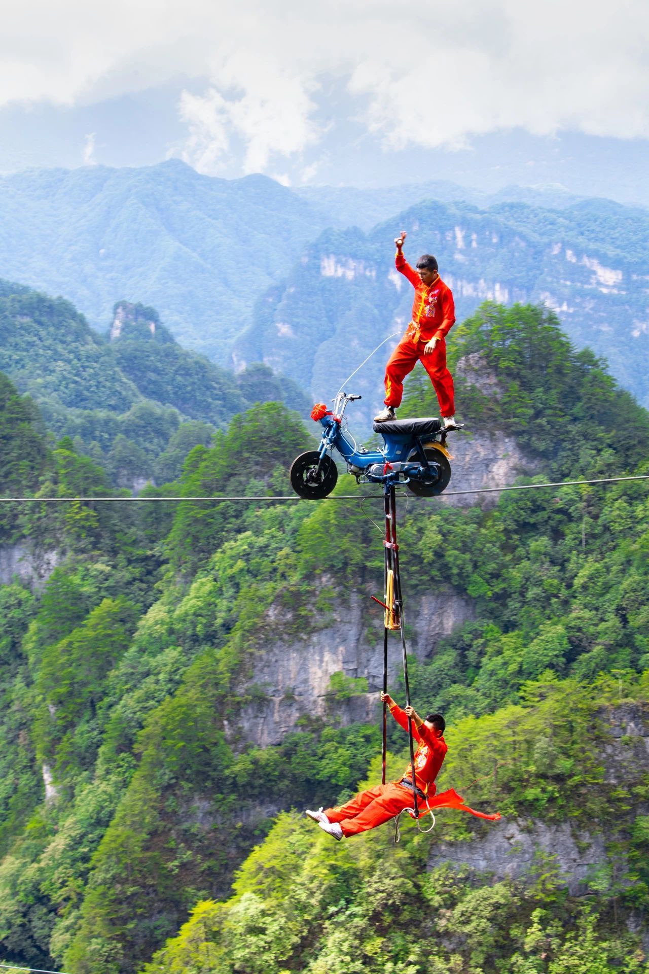 高空自行车项目,表演者骑上特制自行车,在百米钢丝上稳稳前行,甚至还能倒骑、悬空!看得人手心冒汗;而高空摩托车项目,则由表演者驾驶摩托车在细钢丝上飞驰,表演360°旋转、单轮平衡等惊险动作,全场尖叫不断!高空走钢丝则更是惊险,表演者手持一根长杆,如履薄冰般缓步云端山风掀起衣角时钢丝剧烈震颤,他却突然停住,单脚悬空,看得人手心湿透。