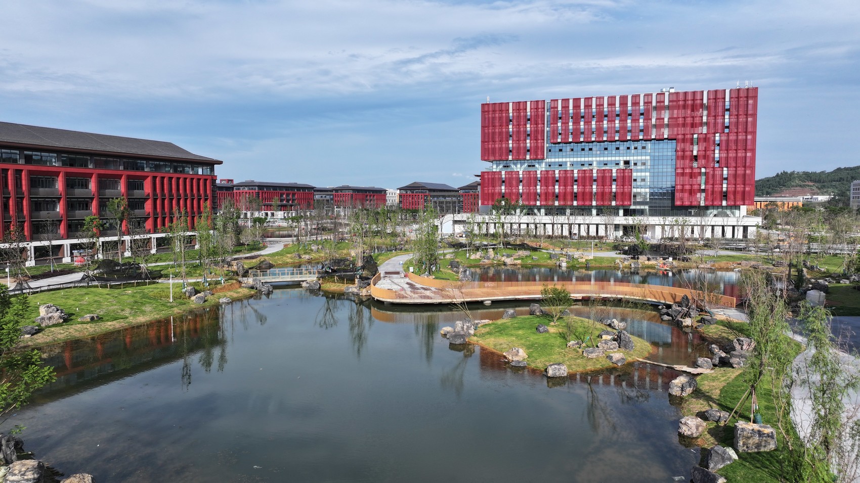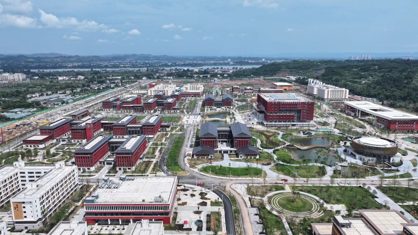 该项目的建设,还突出一个“快”。唐学亭表示,项目于2024年3月破土动工,2025年6月基本建成,仅用时15个月。这一“成绩”,比同类高校建设项目的平均用时,缩短了40%。“项目高峰期时日均投入5000余名工人及1000余台施工设备,施工单位全程运用智能技术,37栋建筑8个月内实现封顶。”唐学亭介绍。