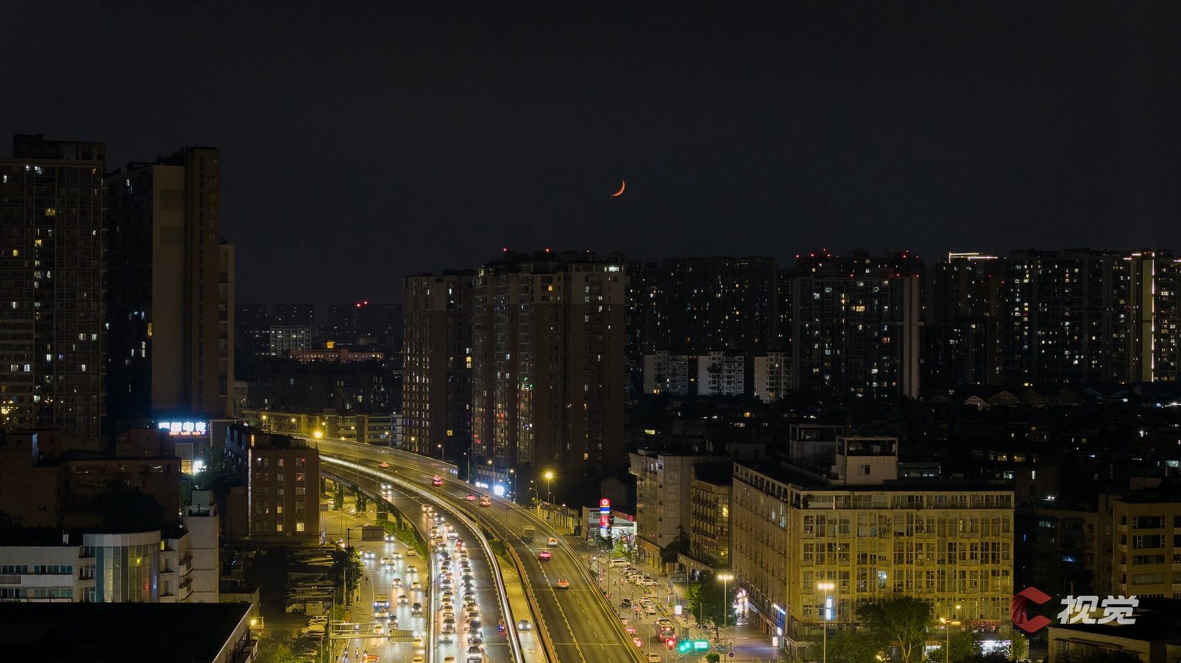 成都二环路营门口附近,“火星伴月”与城市车流同辉。C视觉签约摄影师 杨徐晓