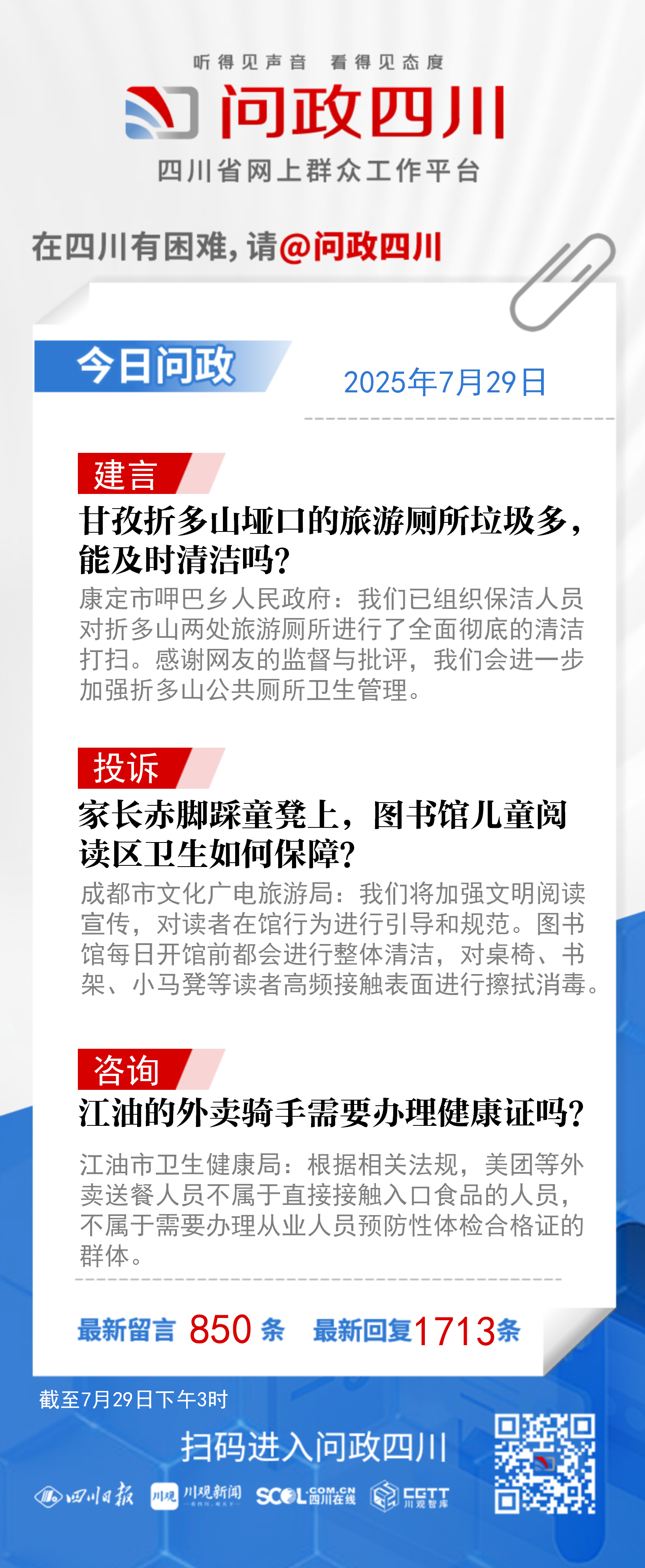 问政四川网友提问:我们一行人到达甘孜州折多山垭口,上厕所时发现里面的垃圾太多了,简直让人无从下脚,希望相关部门能加强公厕的卫生管理,及时清洁打扫,提升游客旅游体验。