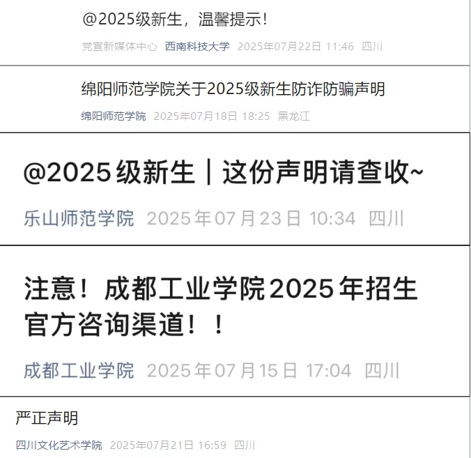 日前,四川多所高校严正声明,提醒2025级新生防诈防骗。这些声明针对的是近期个别机构和个人冒充学校名义进行的诈骗行为,包括:开展违规招生活动,非法盗用学校形象标识,建立非官方的新生群、学院群、咨询群,采用诱导或欺骗胁迫手段推销电话卡、床上用品等,甚至新生和家长骗取钱财。