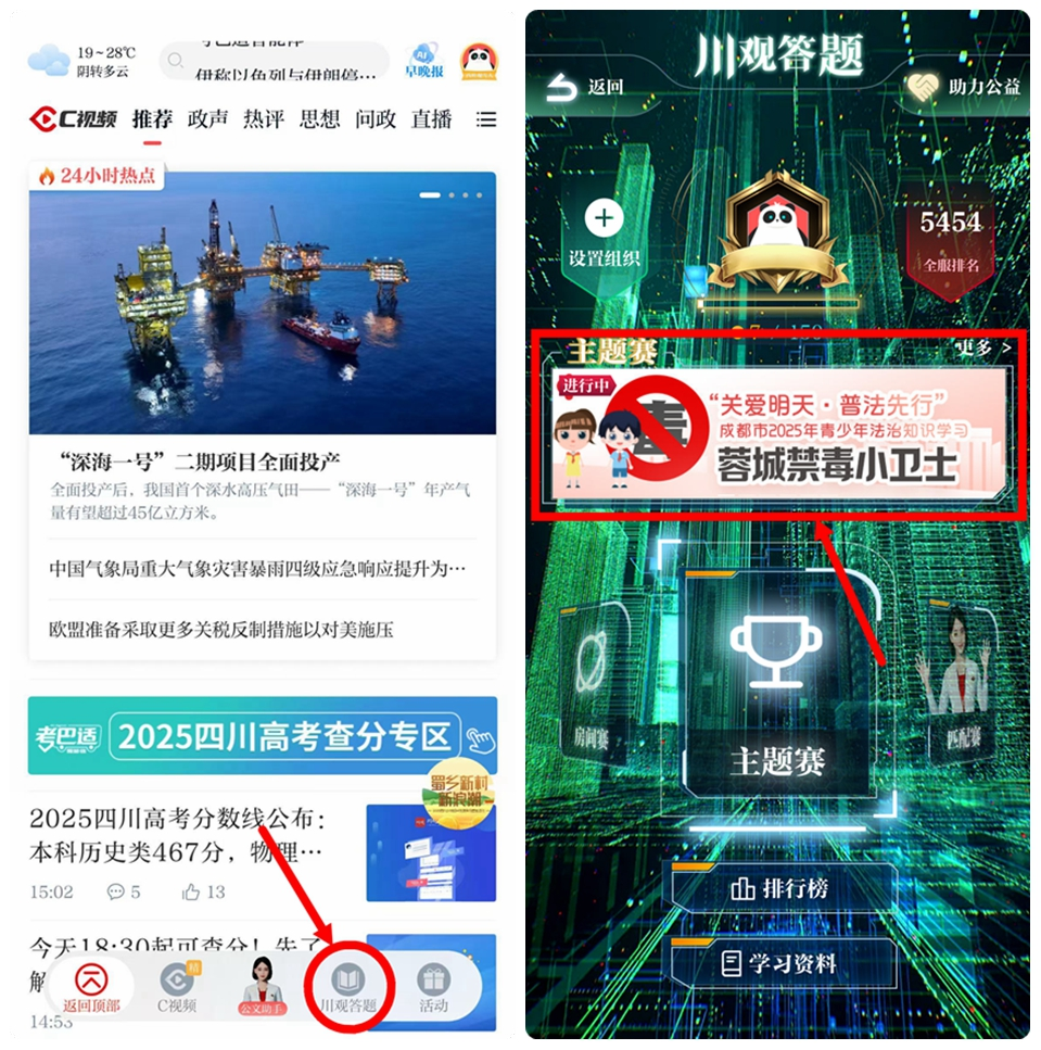 方式一:在川观新闻首页,点击右下方悬浮球,找到《蓉城禁毒小卫士——“关爱明天·普法先行”成都市2025年青少年法治知识学习》活动图片,点击参与活动即可参与;