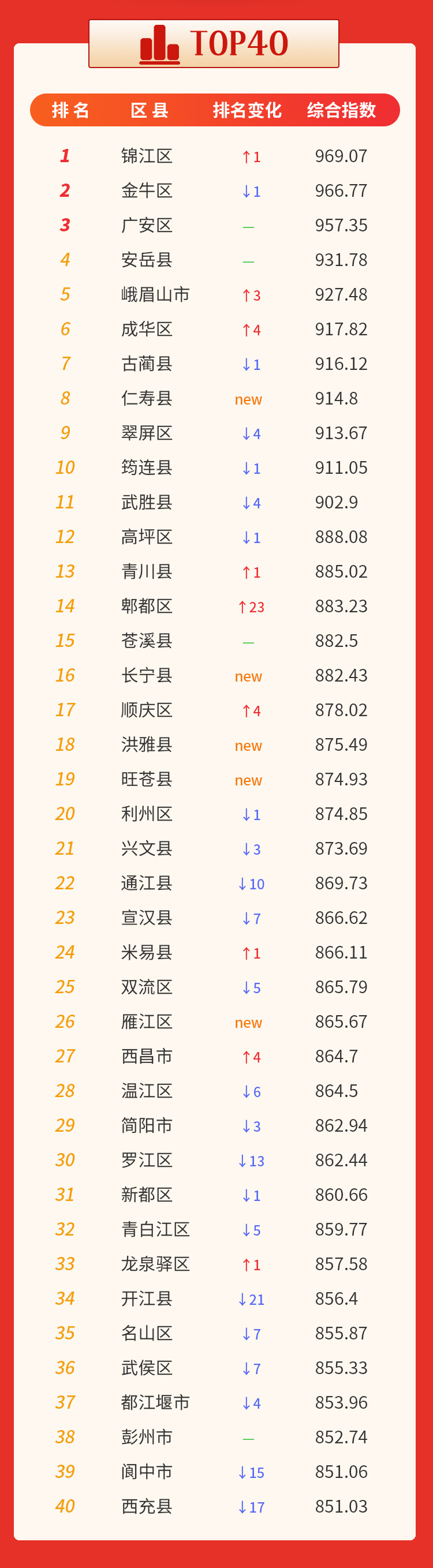 相较于11月,本期新入围县(市、区)5个,眉山市仁寿县新入围即冲至第8名。成都市郫都区排名上升幅度大,从上期第37名升至本期第14名。