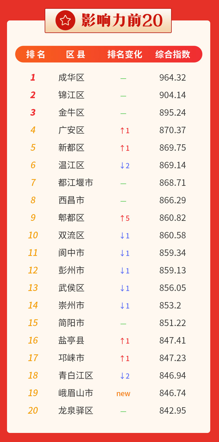 从影响力前20名统计结果看,成都市成华区蝉联第一,其次分别是成都锦江区、金牛区,广安市广安区和成都新都区。乐山市峨眉山市新晋入围,成都市郫都区排名上升幅度较大。