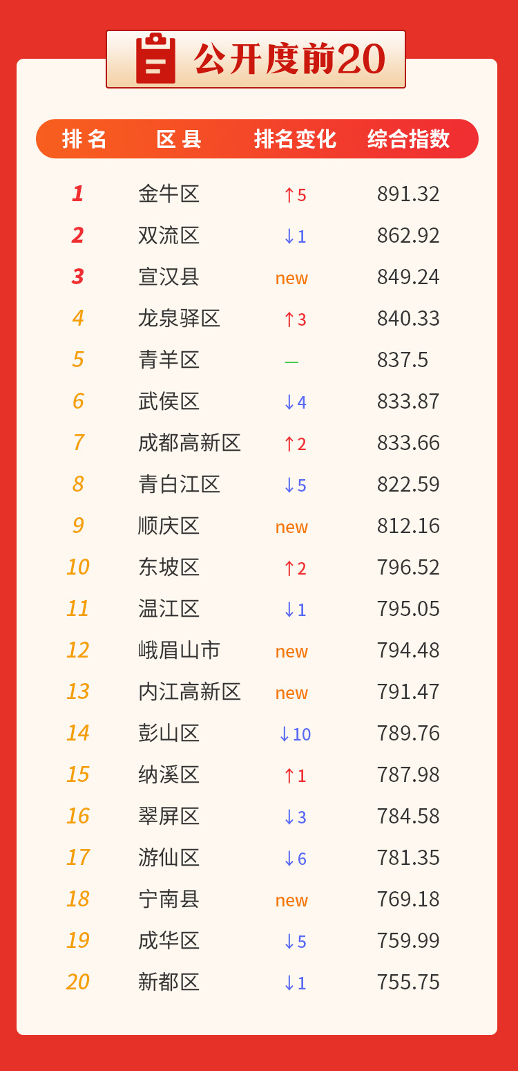 从公开度前20名统计结果看,成都市金牛区名列第一,成都市双流区,达州市宣汉县,成都市龙泉驿区、青羊区入围前五。达州市宣汉县新晋入围即到第3名;成都市金牛区排名上升幅度较大。