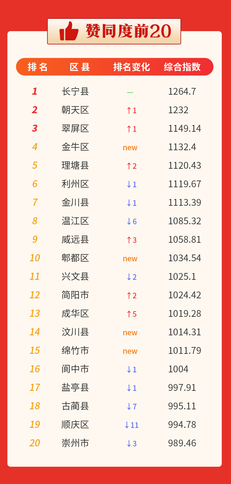 从赞同度前20名统计结果看,宜宾市长宁县蝉联第一,广元市朝天区、宜宾市翠屏区、成都市金牛区、甘孜州理塘县入围前五。成都市金牛区新晋入围即到第4名,成都市成华区排名上升幅度较大。