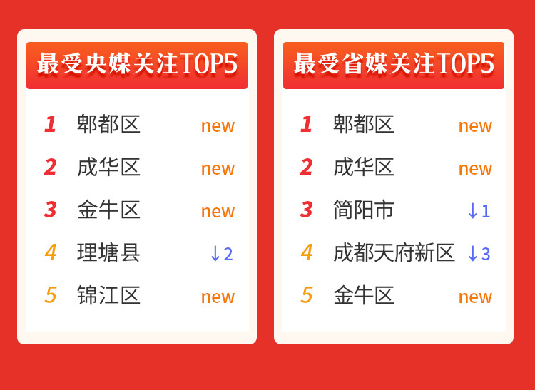 在省媒关注榜中,成都郫都区、成华区、简阳市、天府新区、金牛区名列最受省媒关注前5名,均为成都县区。