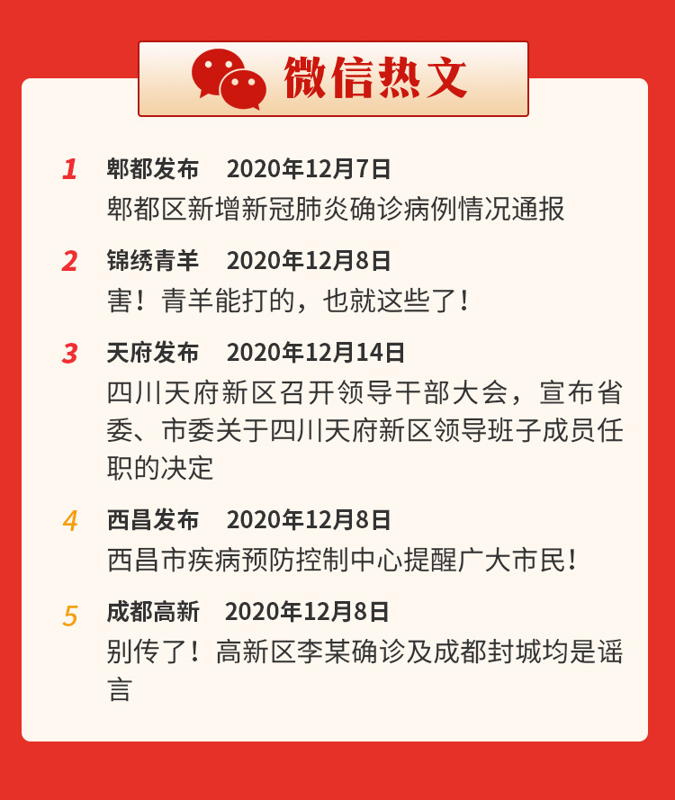 在央媒关注榜中,成都市郫都区、成华区、金牛区,甘孜州理塘县,成都市锦江区名列最受央媒关注前5名,除了因丁真而备受关注的甘孜州理塘县外,入围县区均来自成都,这与成都12月新增新冠肺炎确诊病例有关。