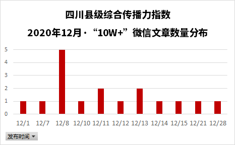 从“10万+”微信文章数量分布情况可看出,12月8日生产的“10万+”微信文章数量最多,共5篇,内容主要是川内各地县级官方媒体及时发布的当地防疫通知、辟谣信息等,显示出县级主流媒体在防疫舆论方面发挥出的传播力、引导力、影响力、公信力。