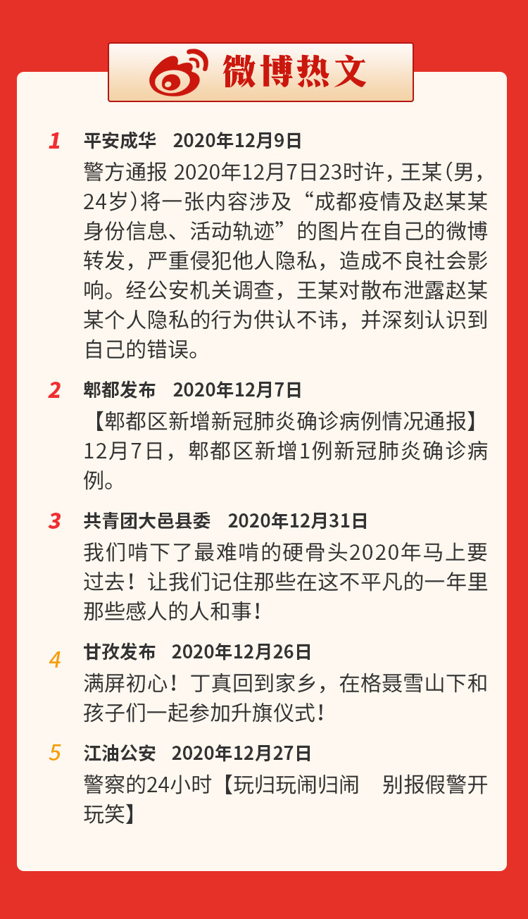 四川脱贫攻坚感人事迹和先进典型、四川高速公路破8000公里、各地关于“十三五”发展成就的回顾以及“十四五”规划展望、气温下降等话题在12月的关注度也较高。