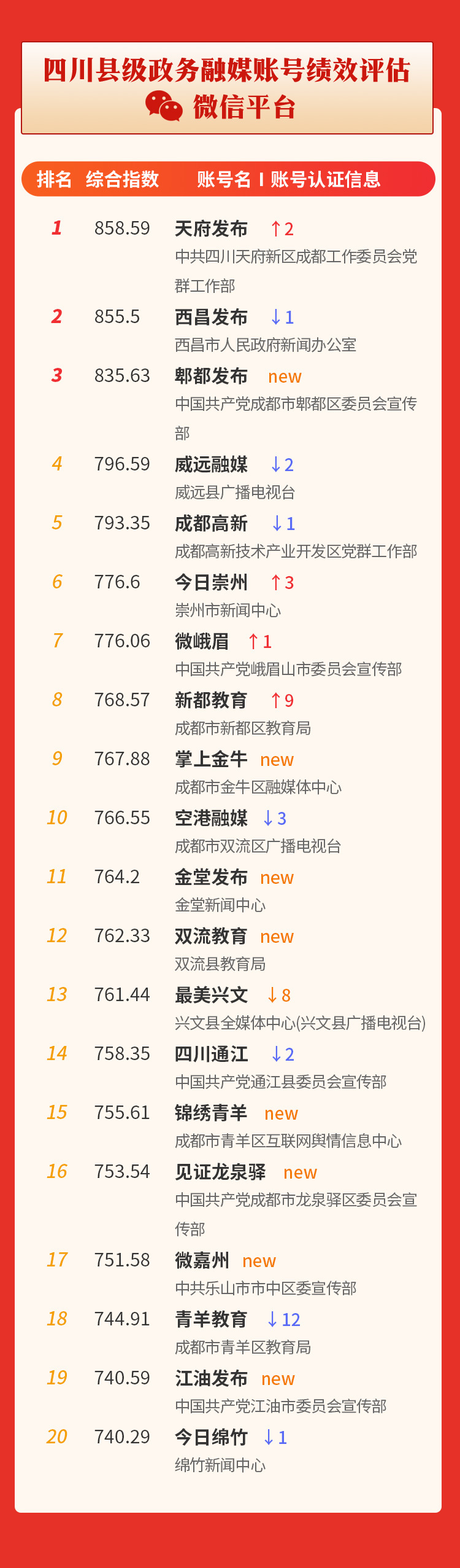 微信平台前3名账号分别是“天府发布”“西昌发布”“郫都发布”。