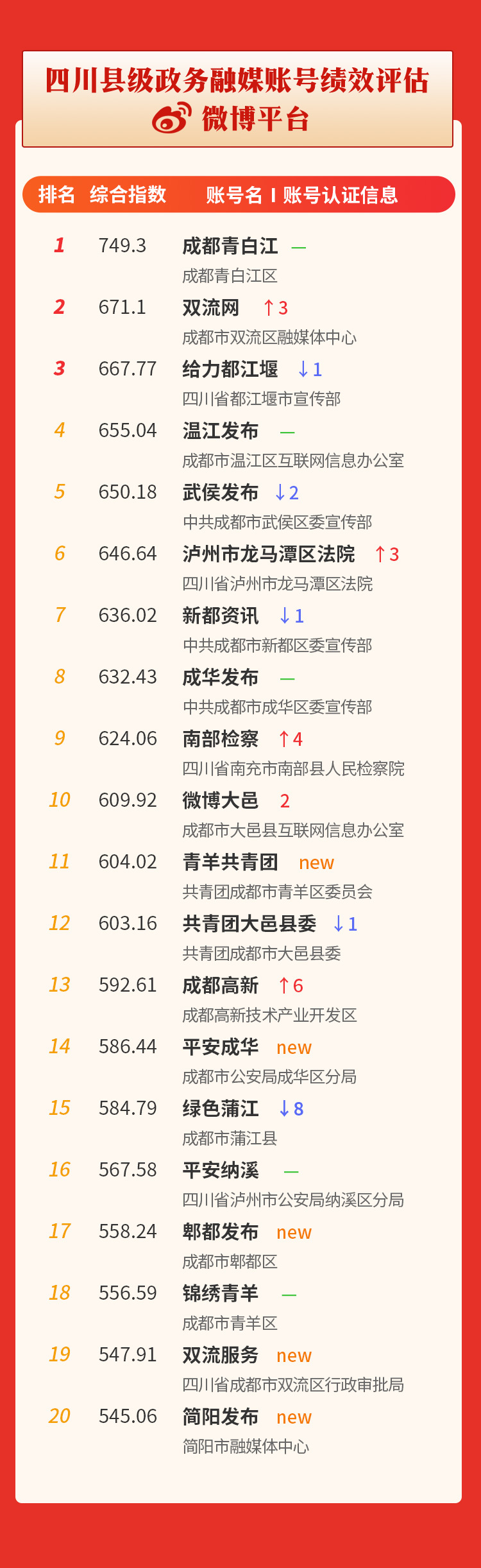 微博平台前3名账号分别是“成都青白江”“双流网”“给力都江堰”。