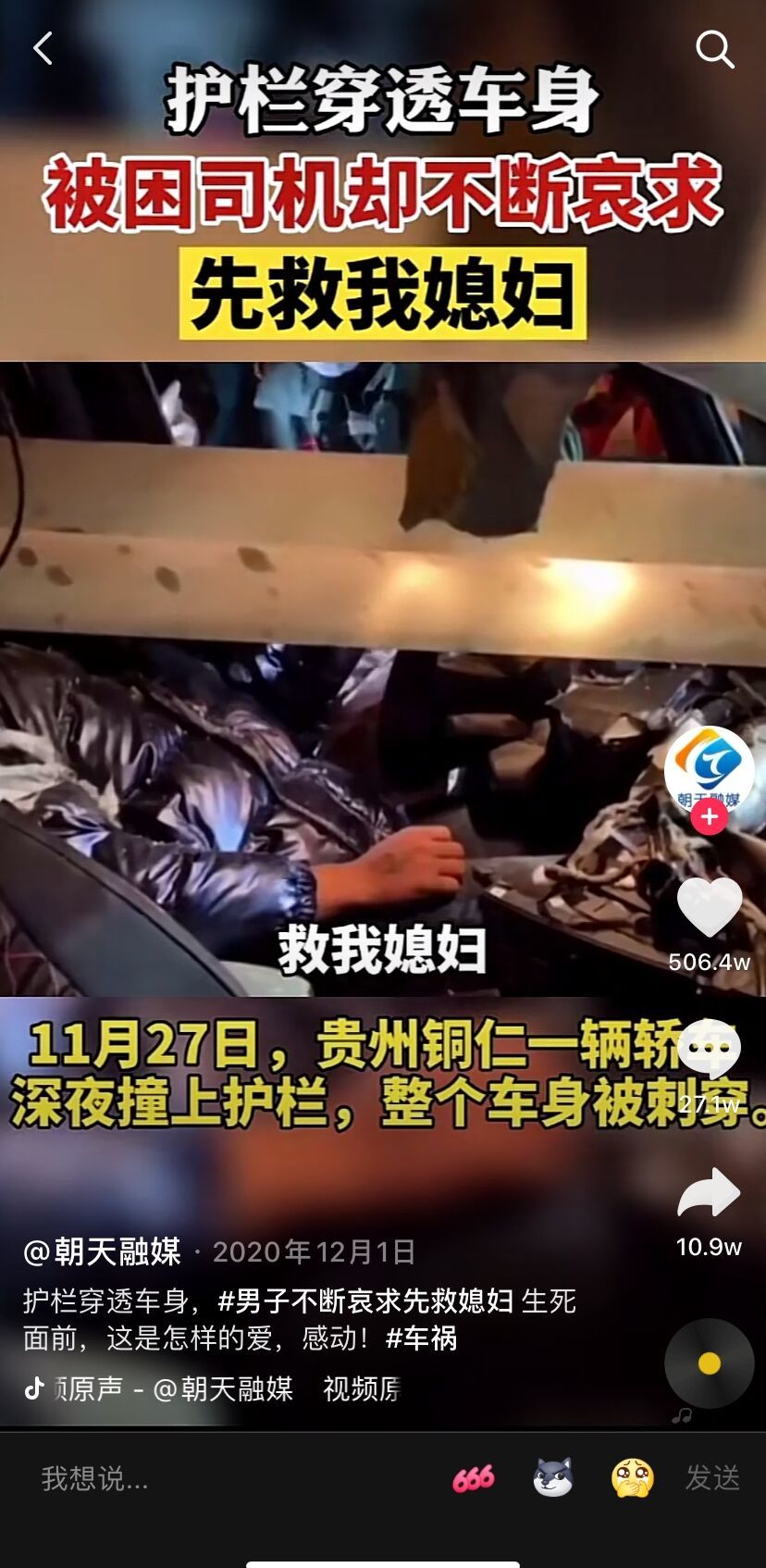 点赞量排名第一的视频,来自“朝天融媒”抖音号在12月1日发布的“护栏穿透车身,男子不断哀求先救媳妇。生死面前,这是怎样的爱,感动!”视频。该新闻发生于11月27日贵州铜仁,故事非常感人,视频获赞超506万。