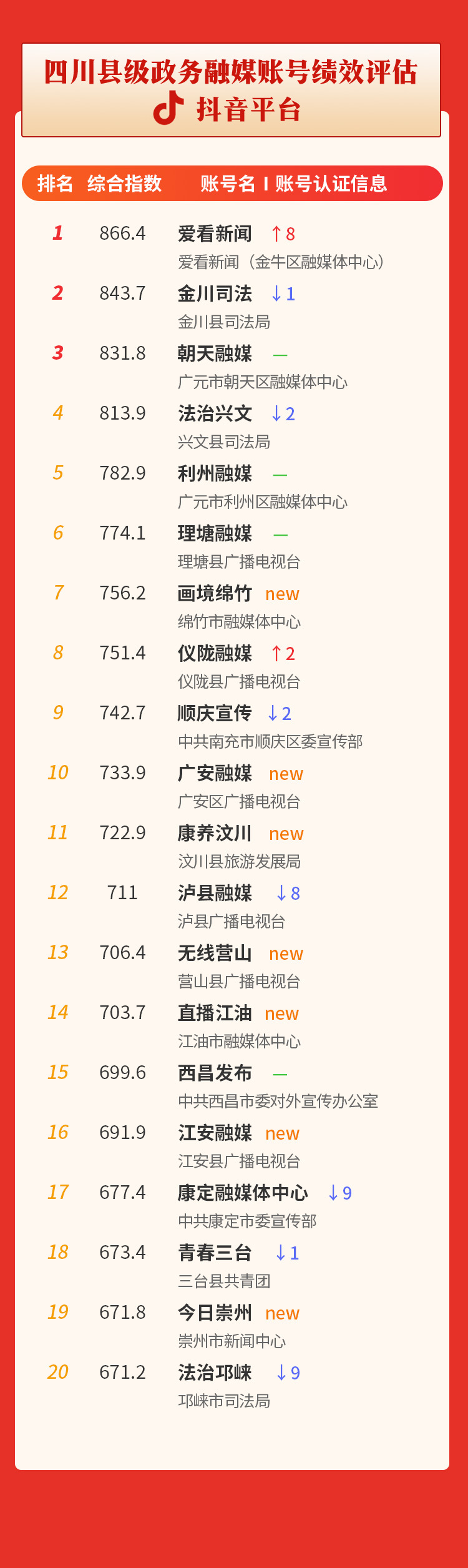 抖音平台前3名账号分别是“爱看新闻”“金川司法”“朝天融媒”。