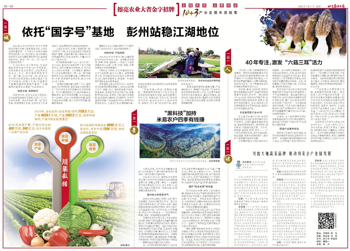 陈孝建是土生土长的彭州人,也是引领当地蔬菜发展的弄潮人,他的企业构建了生产、销售、加工、储存的完整产业链。在他看来,蔬菜批发市场设在产地,有集散市场的功能,客商来了可以进行货源搭配、配齐品种;同时可以对接市场,引领产业持续发展,“协会面向市场公布每天的蔬菜批发价,又通过价格反馈搜集热销、畅销品种情况,指导菜农进行品种筛选和新品引进。”“不能只埋头种田,还要抬头看路。”濛阳镇蔬菜种植大户赵光友也说蔬菜品种的选择很关键,每年他都要从种子公司、育苗企业、农资公司、市场等多方打探,看当年当季什么品种种得多、卖得好,别人种了的他就少种,走差异化的路子。“蔬菜是富民强市的重要支撑,产业基地做大了,要提升产品效益。”彭州市农业农村局有关负责人介绍,今后要不断改变传统农业种植模式,通过科技赋能、品种改良、园区建设等,提高彭州农业规模化、标准化和机械化程度,促进彭州蔬菜高质量发展。