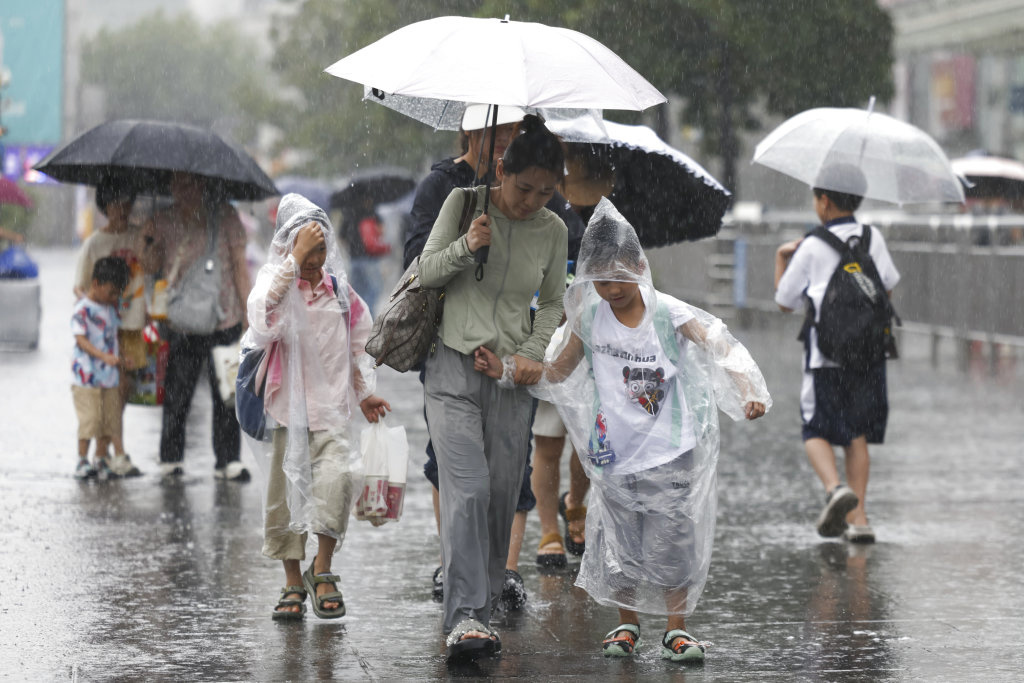 7月30日,旅客在上海站南广场冒雨前行。