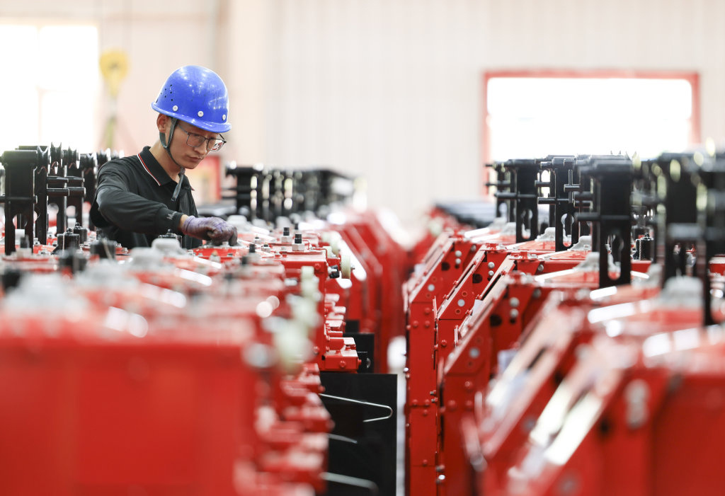 7月29日,工人在新疆钵施然智能农机股份有限公司的采棉机生产车间组装配件。