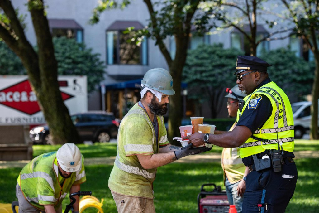 7月29日,在美国马萨诸塞州波士顿,一名警察给建筑工人带来冷饮。