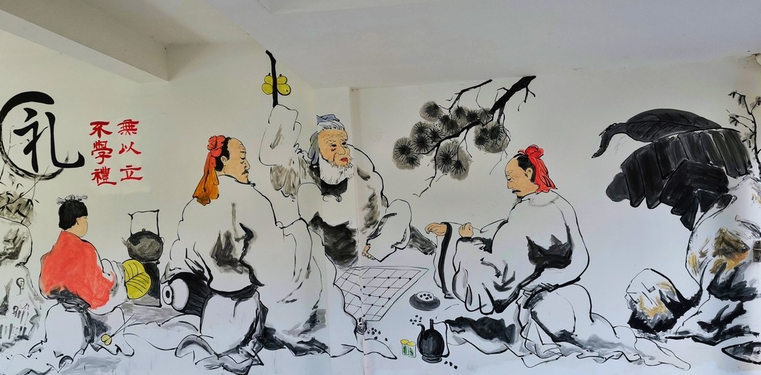 60多岁的张大爷是林溪居小区的热心居民,他向楼栋长反映“小区老人多,平时没事就喜欢聚在一起拉家常,但是小区公共设施太少,老人们缺少交流的平台。”楼栋长将这一情况向小区管委会反映,小区管委会立即确定了改造小区架空层的方案,林溪社区邀请专业墙体彩绘老师以古典礼仪为基准,对林溪居篮球场旁架空层的墙体进行彩绘,打造了一幕幕关于古典礼仪的生动场景,旨在传扬文明风貌和社区精神文化,群众集思广益,将其命名为“林溪阁”。