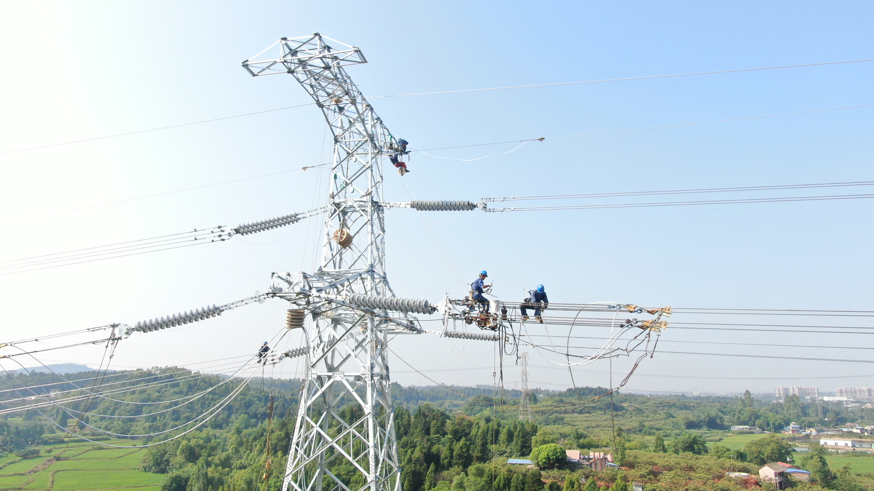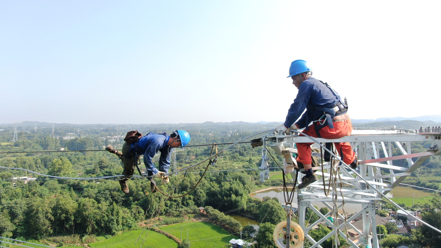 不远处的NA19号塔上,高空作业人员正在开展附件安装,他们两人一组,借助手扳葫芦将导线嵌入线夹内,完成导线固定。