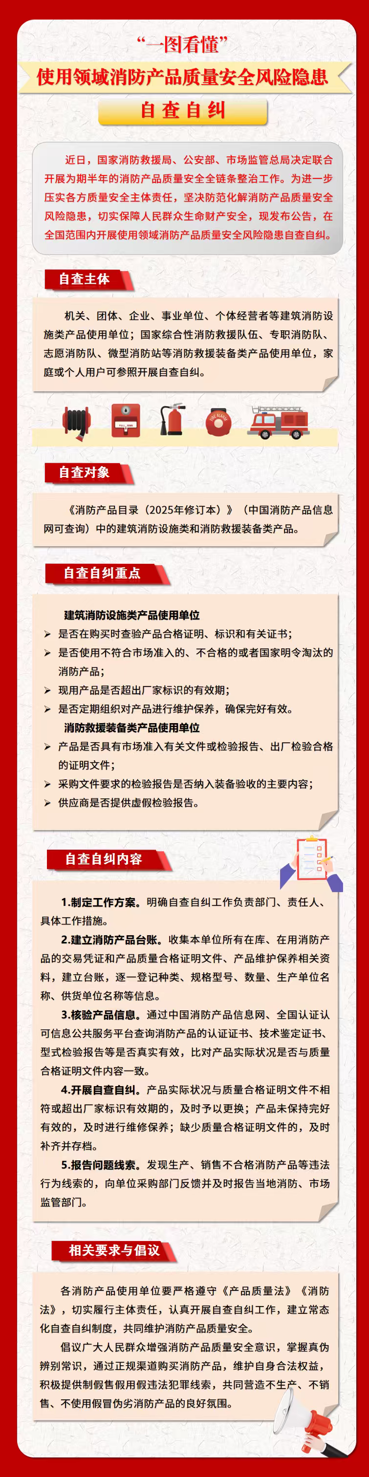 近日,国家消防救援局、公安部、市场监管总局联合印发工作方案,部署自今年7月至12月在全国开展消防产品质量安全全链条整治工作,坚决防范化解消防产品质量安全风险隐患,全面加强消防产品质量安全“一件事”全链条监管,切实保障人民群众生命财产安全。