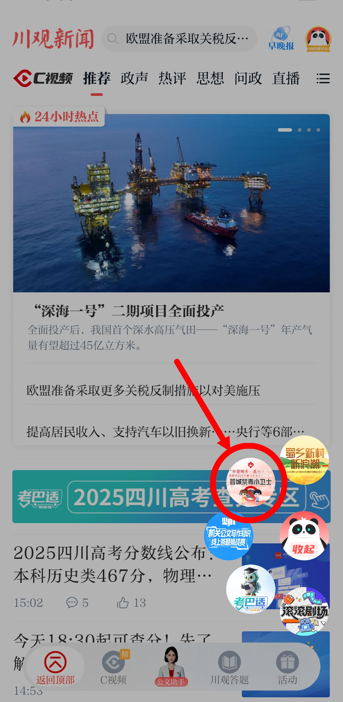 方式一:在川观新闻首页,点击右下方悬浮球,找到《蓉城禁毒小卫士——“关爱明天·普法先行”成都市2025年青少年法治知识学习》活动图片,点击参与活动即可参与;