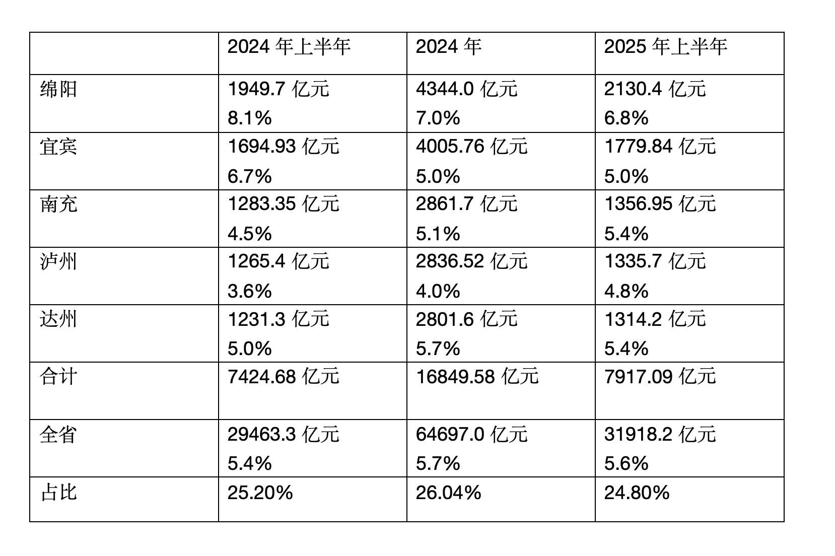 记者梳理发现,就上半年经济运行数据而言,5城经济总量排名未变,但在GDP增速方面,仅绵阳以6.8%的“成绩”跑赢5.6%的全省平均增速。