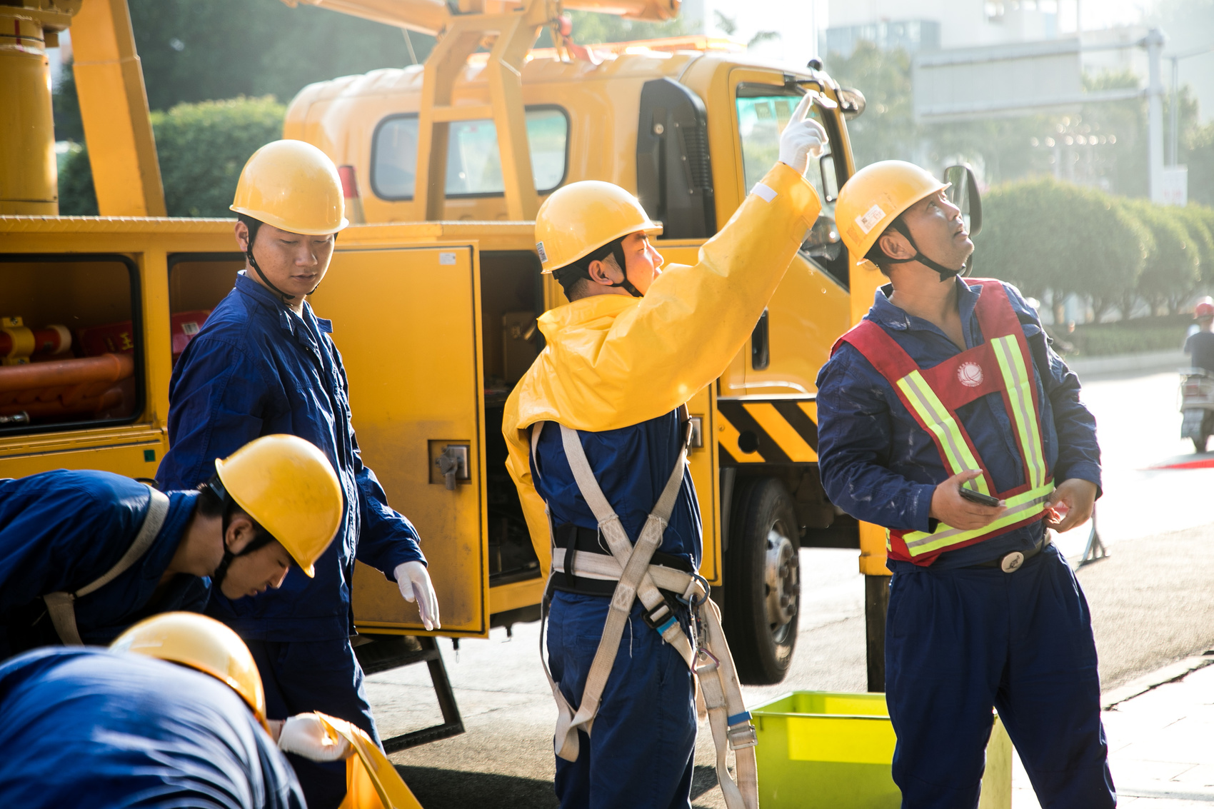 7时15分,随着绝缘斗臂车缓缓升起,两名作业人员抵达5米高空。他们先用验电器确认停电范围,随后对带电部位加装绝缘遮蔽罩,动作娴熟如行云流水。地面人员则通过智能管控平台实时监测线路负荷变化,确保作业期间电网运行无异常;工作负责人则不断提醒作业人员注意安全事项。