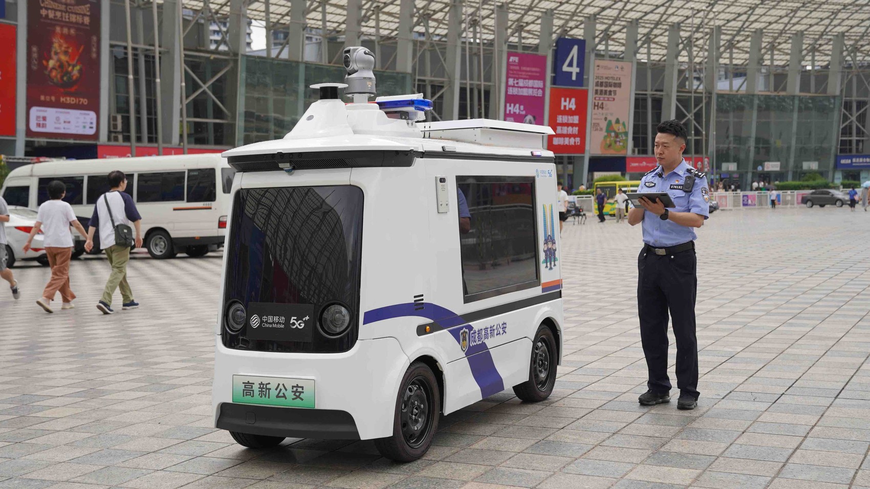 离开警务站,行走在世运村B区,记者遇上了一辆驶来的车,看似无奇,实则内藏乾坤。“这是我们最新投用的无人警用巡防车,可别小看了它。”黄珏文介绍说,这款车由成都高新公安联合高新移动公司打造,具有5大功能。