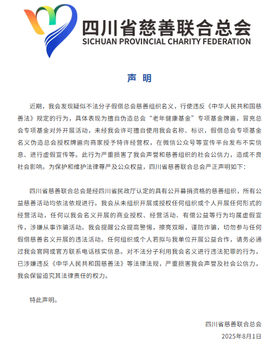 8月1日,四川省慈善联合总会发布严正声明称,近期,该会发现疑似不法分子假借总会慈善组织名义,行使违反《中华人民共和国慈善法》规定的行为,具体表现为擅自伪造总会“老年健康基金”专项基金牌匾,冒充总会专项基金对外开展活动,未经该会许可擅自使用该会名称、标识,假借总会专项基金名义伪造总会授权牌匾向商家授予特许经营权,在微信公众号等宣传平台发布不实信息、进行虚假宣传等。