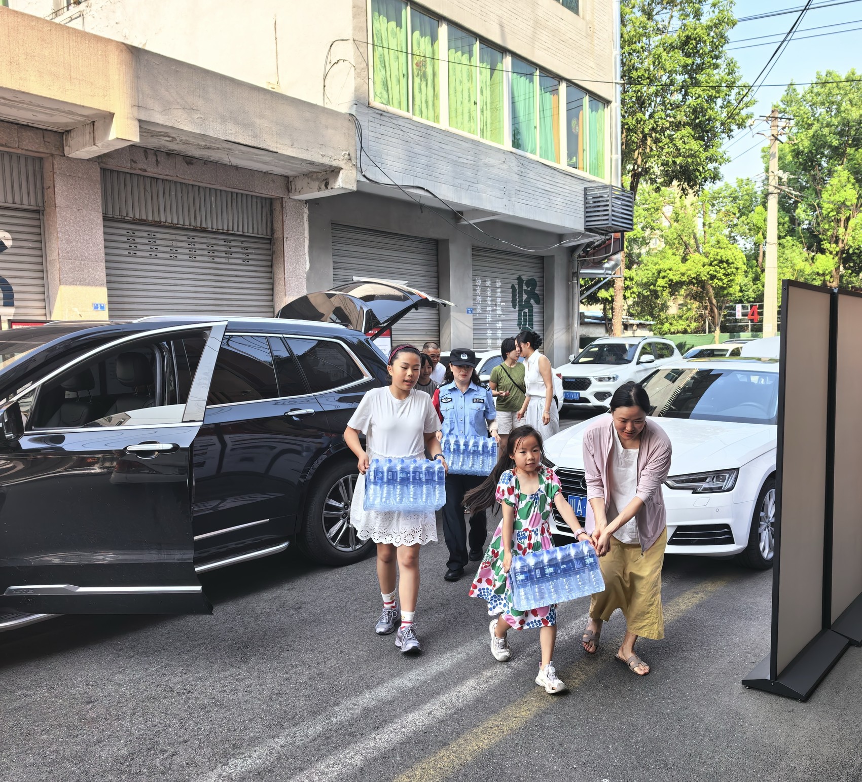 白鹤社区驿站的场景更有意思。7岁小朋友胡伊诺是跟着姐姐胡馨予一起来献爱心,24瓶水对她来说实在沉了点。门口的社区综治队员见状便迎上去搭把手。“这几天在马路上执勤,真有被火烤的感觉。”社区综治队员看着刚放下的那几件水说,“孩子们送这么多水来,够我们喝好些天,真暖心。”