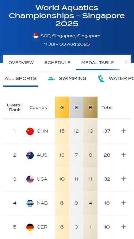 ▷3日晚,2025年新加坡世界泳联世锦赛正式落下帷幕。中国队共获得15枚金牌、12枚银牌和10枚铜牌,结束本次世锦赛之旅。