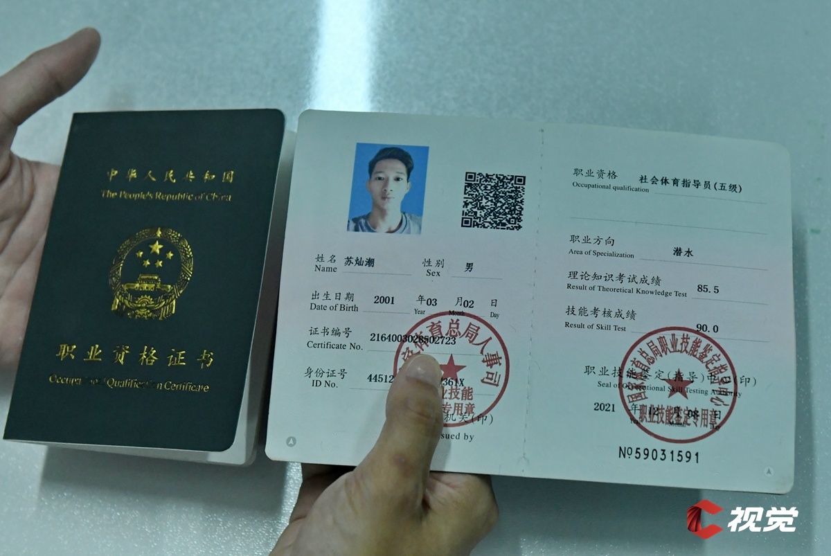 8月1日,潜水教练苏灿潮向记者展示他的潜水教练证件。