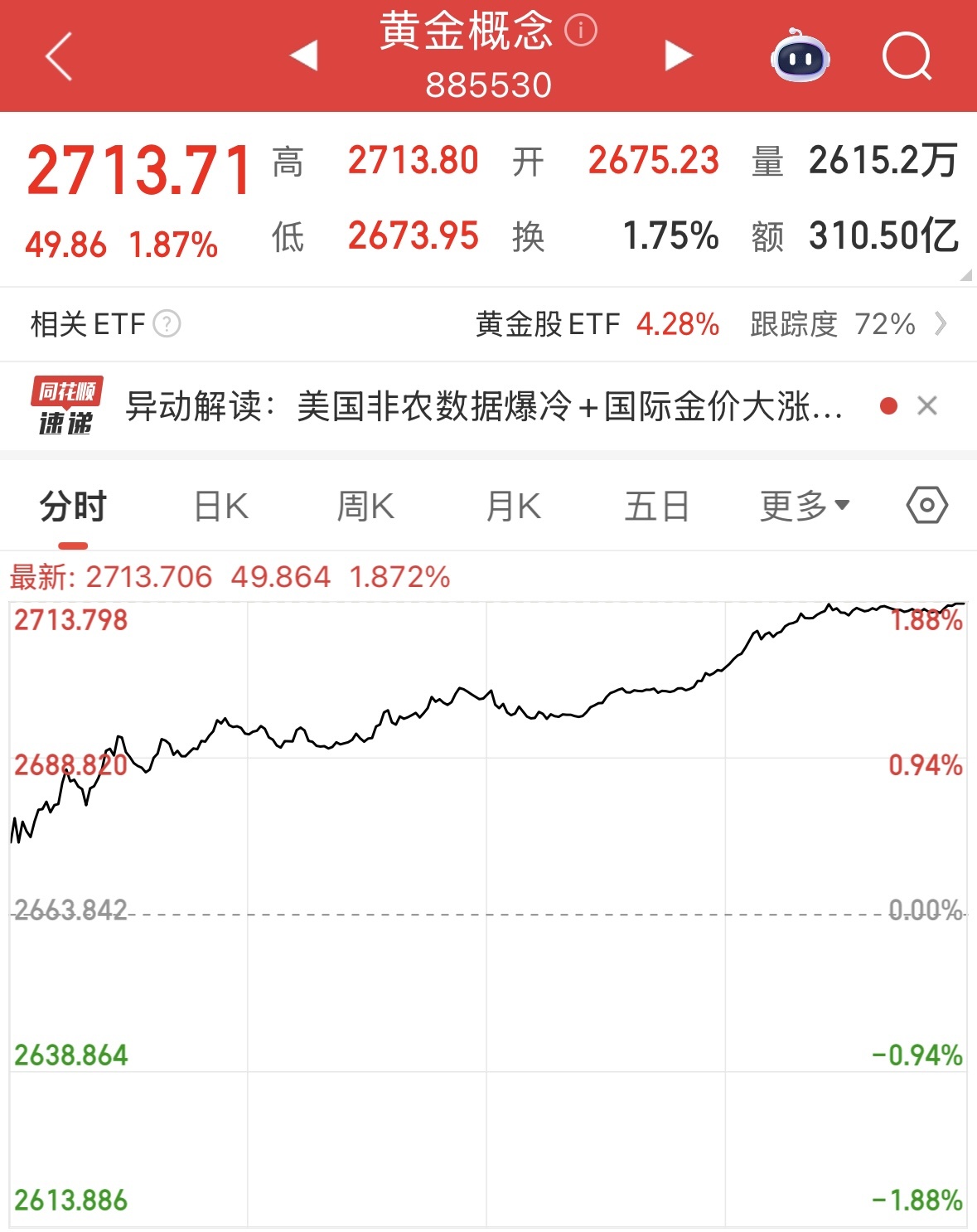 美国上周末公布的爆冷就业数据重挫美股,并迅速点燃全球避险情绪,推动伦敦黄金现货价格直线拉升涨2.22%,COMEX黄金期货价格涨超2%。这一由美股动荡引发的“黄金热” 直接传导至今日A股市场:国内黄金概念股应声而起,板块整体大涨1.87%,成交额达310.5亿元,核心个股集体上攻,清晰展现出外部市场波动的传导效应。