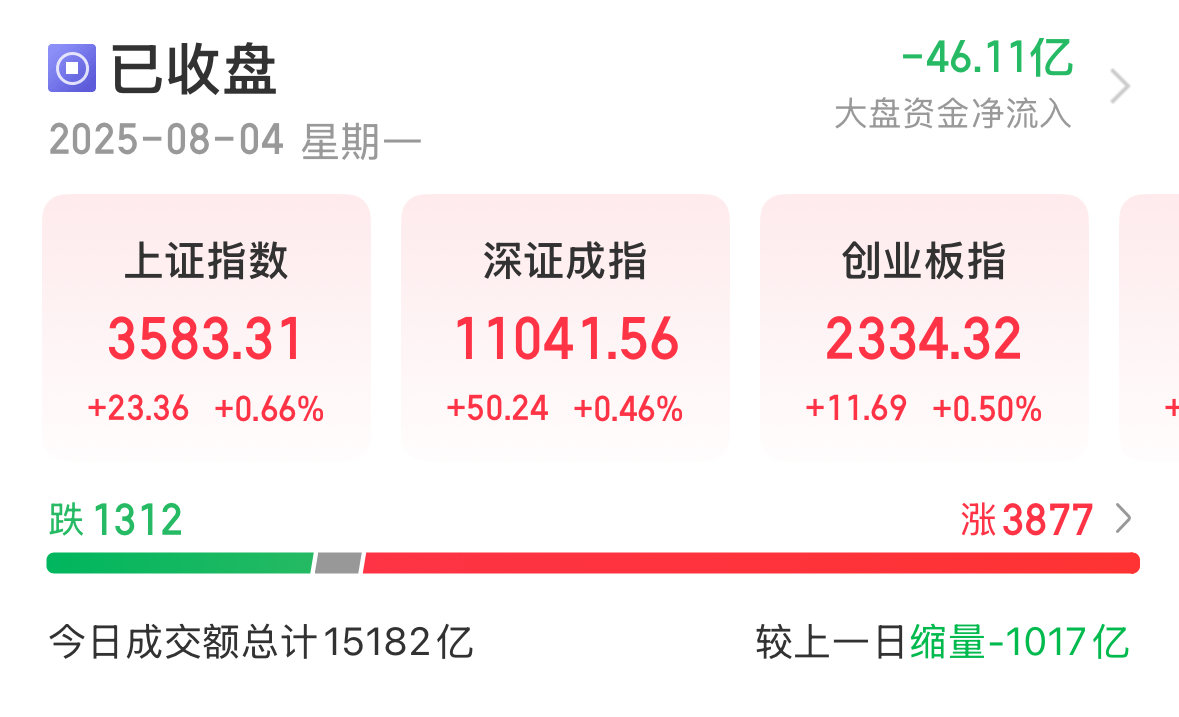 8月4日,A股三大指数集体收涨,沪指涨0.66%,收报3583.31点;深成指涨0.46%,收报11041.56点;创业板指涨0.50%,收报2334.32点。全市场成交额15182亿,较上周五缩量千亿。全市场超3800只股票上涨。