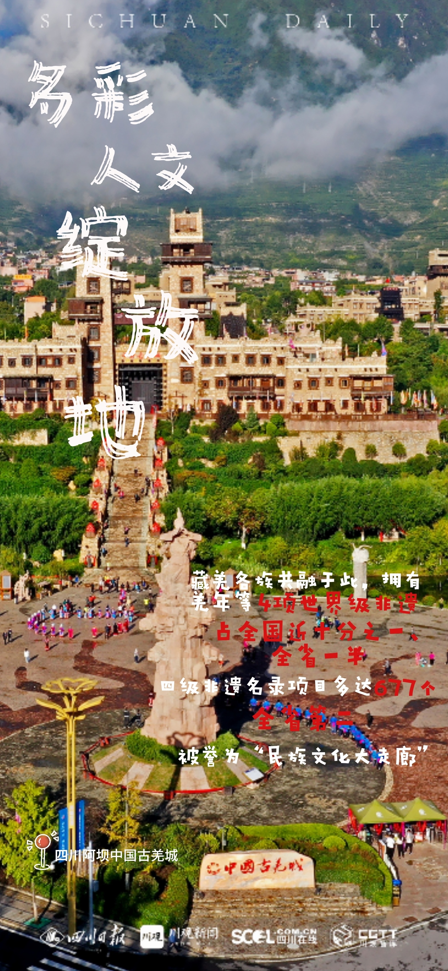 阿坝是多彩人文绽放地。江河文明交汇于此,“牦 牛革命”诞生于此,藏羌各族共融于此,流淌血脉中的多彩人文,夺目而瑰丽。