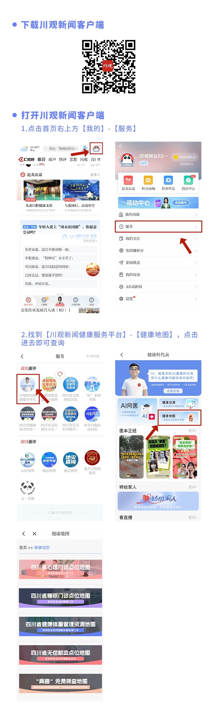 方式一:进入川观新闻健康服务平台“健康科代表”,点击“健康地图”,即可查阅。