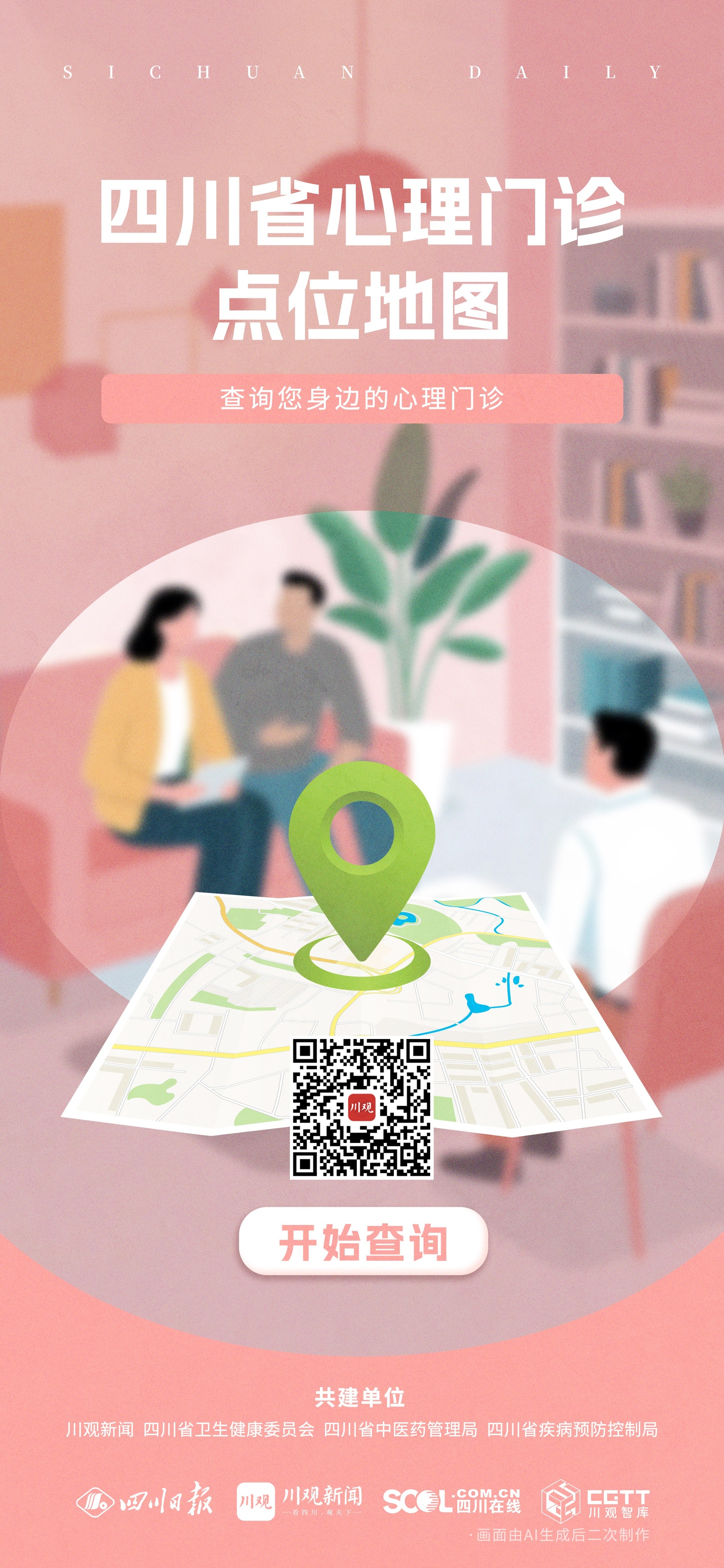 打开川观新闻客户端,进入健康服务平台“健康科代表”,找到“四川省心理门诊、睡眠门诊点位地图”,或者关注“健康四川官微”微信号,点击左下方菜单栏的【健康四川便民地图】功能,就能立马看到附近的门诊信息——地址、电话一目了然,再也不用托人打听。