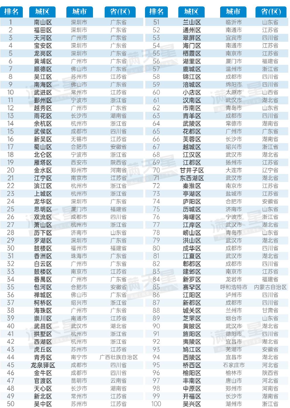 上榜区分别是:成都市武侯区、双流区、龙泉驿区、金牛区,宜宾市翠屏区,成都市锦江区,绵阳市涪城区,成都市青羊区、成华区、郫都区,泸州市江阳区,成都市新都区和德阳市旌阳区。