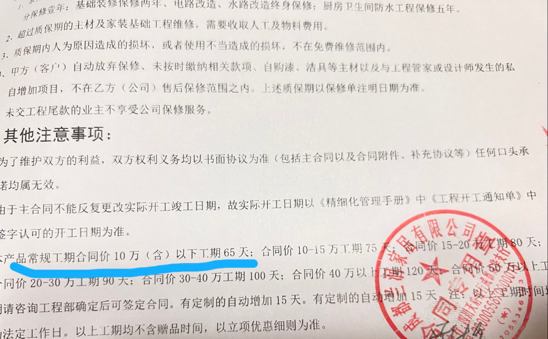 记者查阅侯先生与兰润家居签订的《成都市家庭装修工程施工合同》《成都市家庭装饰装修工程施工合同条款》发现,其与兰润家居和委托施工方分别于2024年12月31日、2025年3月11日签订合同。其中,《成都市家庭装修工程施工合同》上明确写有“产品常规工期合同价10万(含)以下工期为65天”。《成都市家庭装饰装修工程施工合同条款》则明确写有“由于乙方原因致使工期延误,每延误一日向甲方支付30元/天的违约金”。