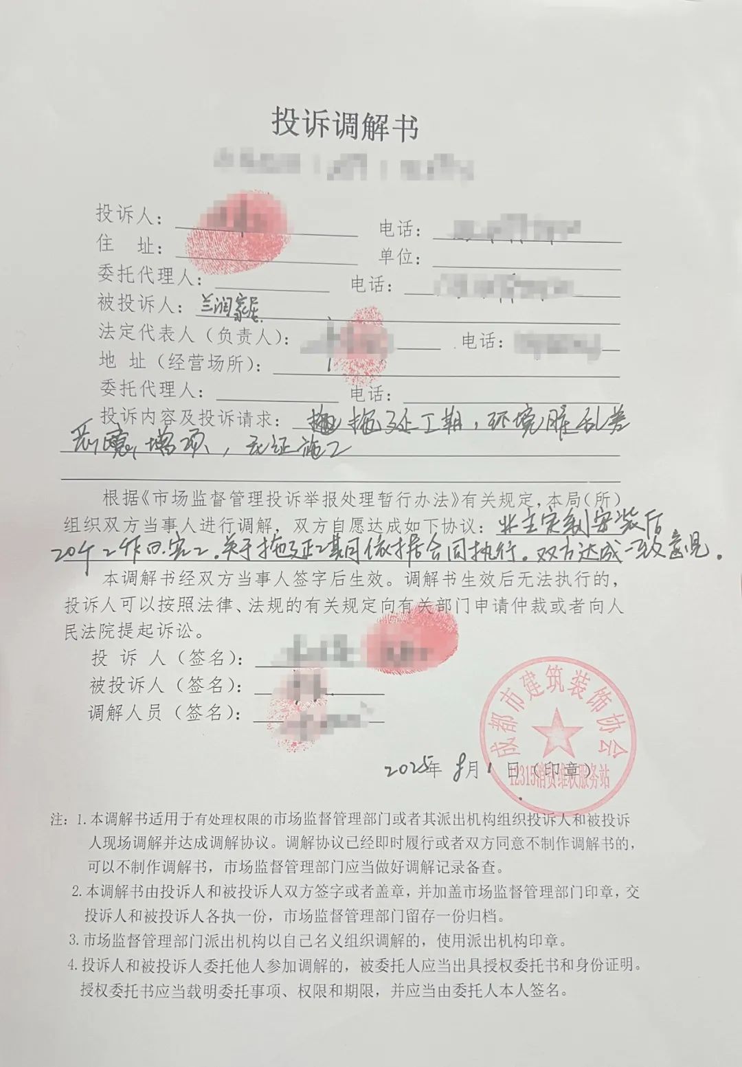 8月1日,在成都市装协工作人员和记者的见证下,5位消费者与兰润家居3位负责人现场签订《投诉调解书》,双方达成和解。