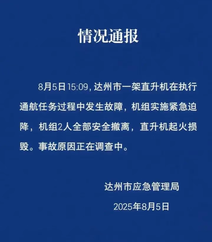 8月5日15:09,达州市一架直升机在执行通航任务过程中发生故障,机组实施紧急迫降,机组2人全部安全撤离,直升机起火损毁。事故原因正在调查中。