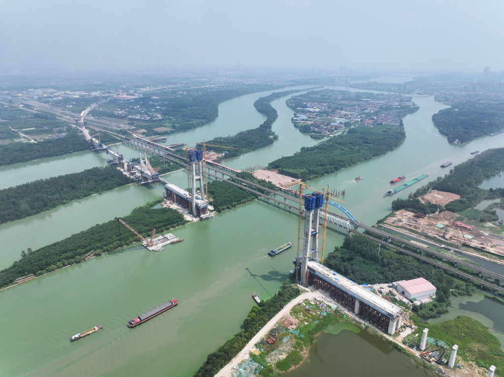 这是8月5日拍摄的沪渝蓉高铁跨京杭运河斜拉桥建设现场(无人机照片)。