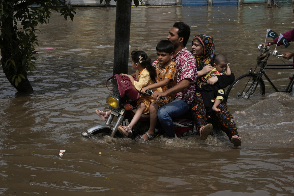8月3日,在巴基斯坦拉合尔,人们经过积水的街道。