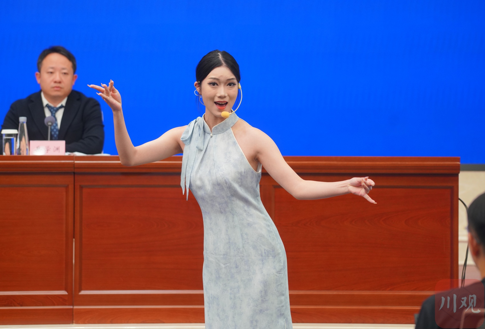川剧青年演员的亮相,成为全场新闻发布会中的一个动人环节。梁浩龙、李玲琳、但歆婷、薛川、吴佳睿等5位优秀青年川剧演员陆续登场。新闻发布厅短时间内化身舞台,容纳了川剧演员的献唱和参会者的持续掌声。