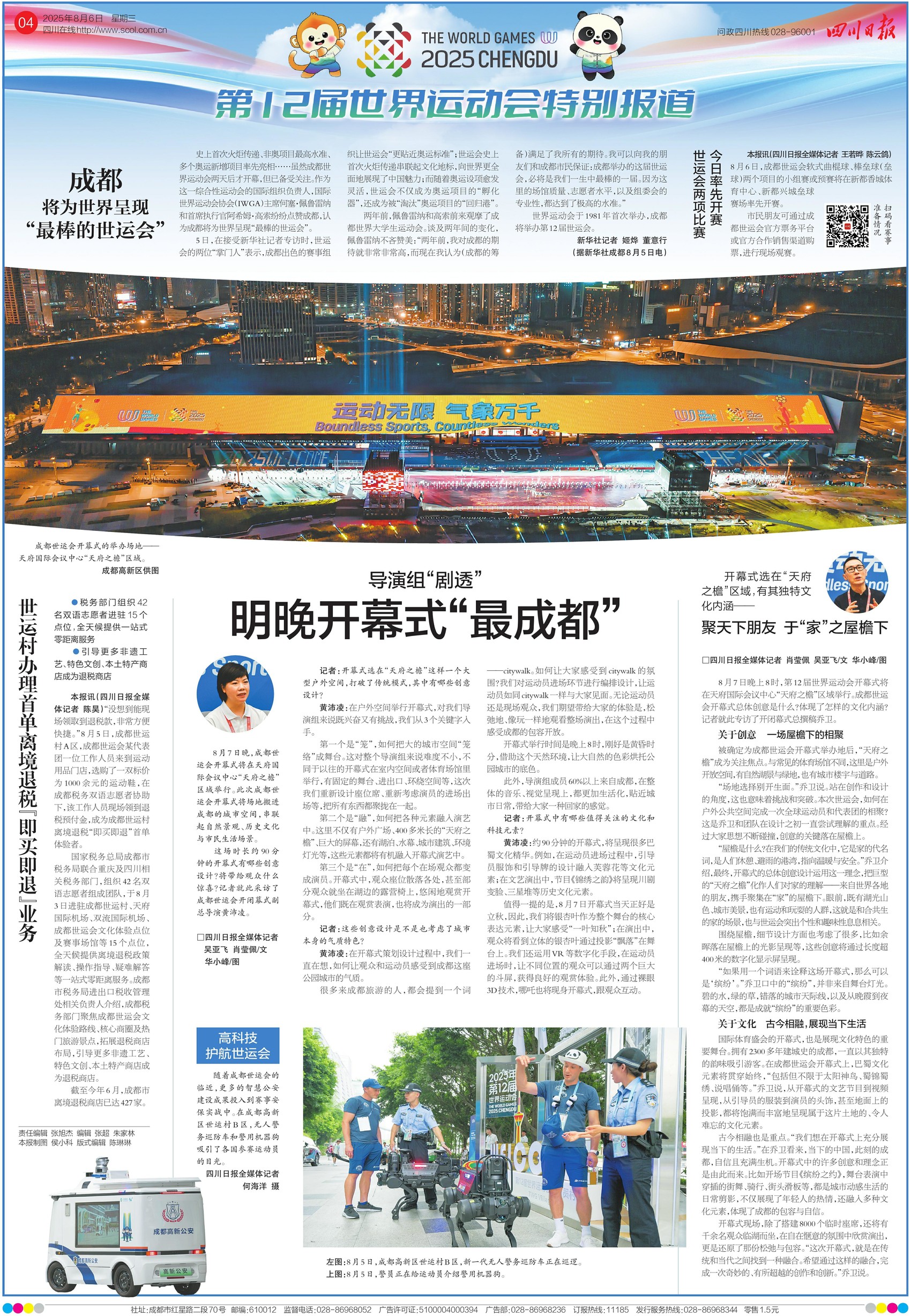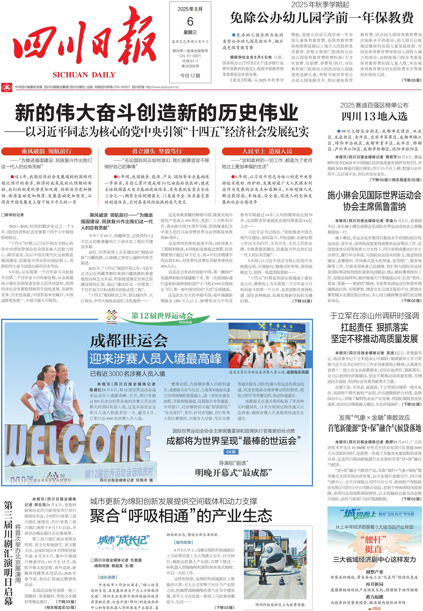8月5日,第12届世界运动会迎来运动员入境最高峰。截至5日,已累计近3000名涉赛人员入境。成都海关多措并举,确保涉赛人员及物资快速安全通关。成都世运会明日开幕,看副总导演黄沛凌剧透开幕式亮点,将场地搬进城市空间,用创意设计打造包容开放的开幕式。听总撰稿乔卫分享“天府之檐”背后的文化内涵,了解巴蜀文化元素如何与当代成都生活巧妙融合。今日一、四版,一起解锁这场体育文化盛宴的精彩前奏。