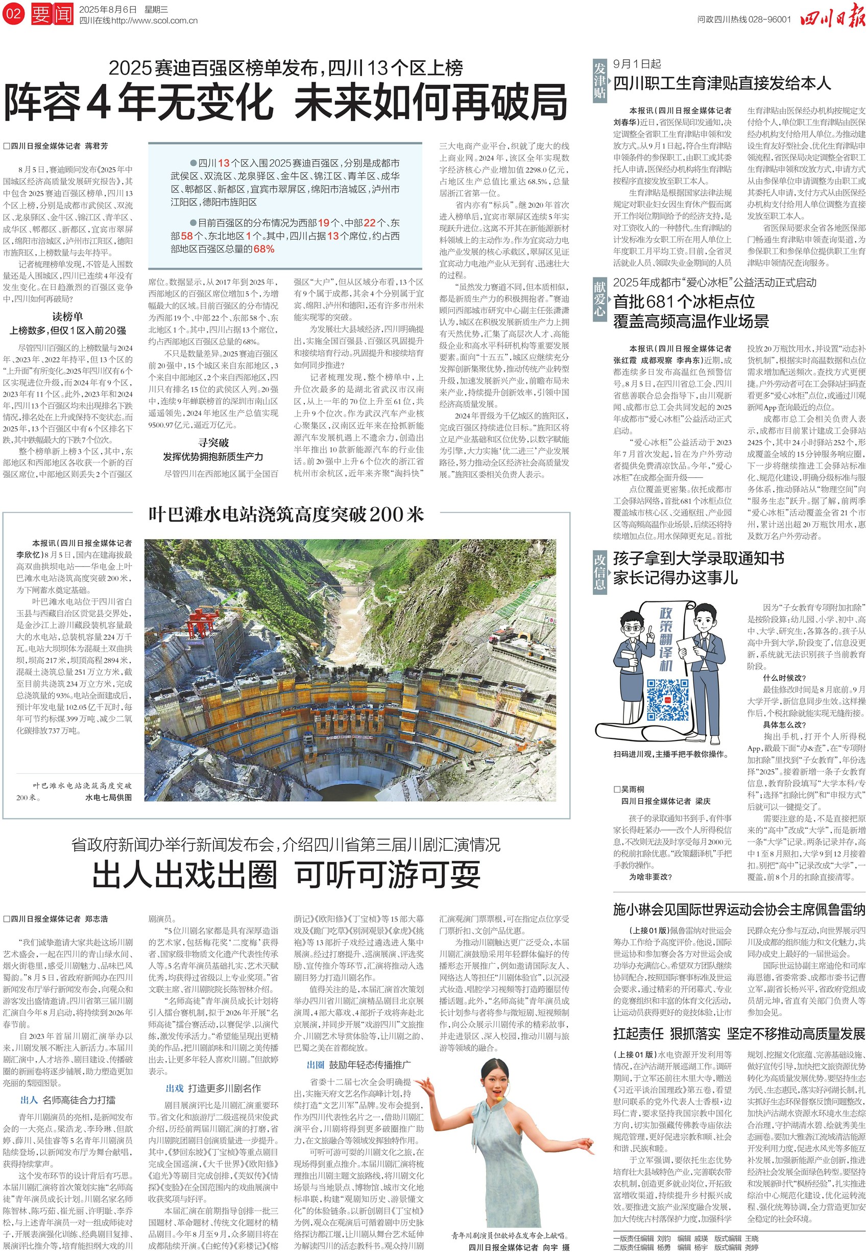 8月5日公布的2025赛迪百强区榜单中,四川有13个区上榜,约占西部地区百强区总量的68%。总体来看,四川入围阵容已连续4年未发生变化,且区域分布较为集中。发展壮大县域经济,巩固提升和接续培育如何同步推进?关注今日二版,看百强区之争四川如何再破局。