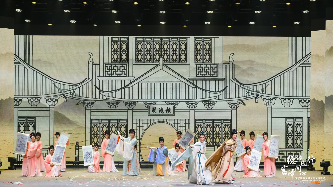 作为本次活动高潮,8月4日晚在富阳影剧院上演的“山河共舞,德富同行”文化惠民演出引发强烈反响。德格县带来的精编版音乐剧《岭·格萨尔王》以60分钟浓缩史诗,通过动态LED巨幕与藏语演唱结合,生动呈现格萨尔王的传奇历程。富阳越剧艺术传习院则以原创剧目《富春长歌》,演绎黄公望创作《富春山居图》的艺术人生,实现千年史诗与水墨经典的时空对话。