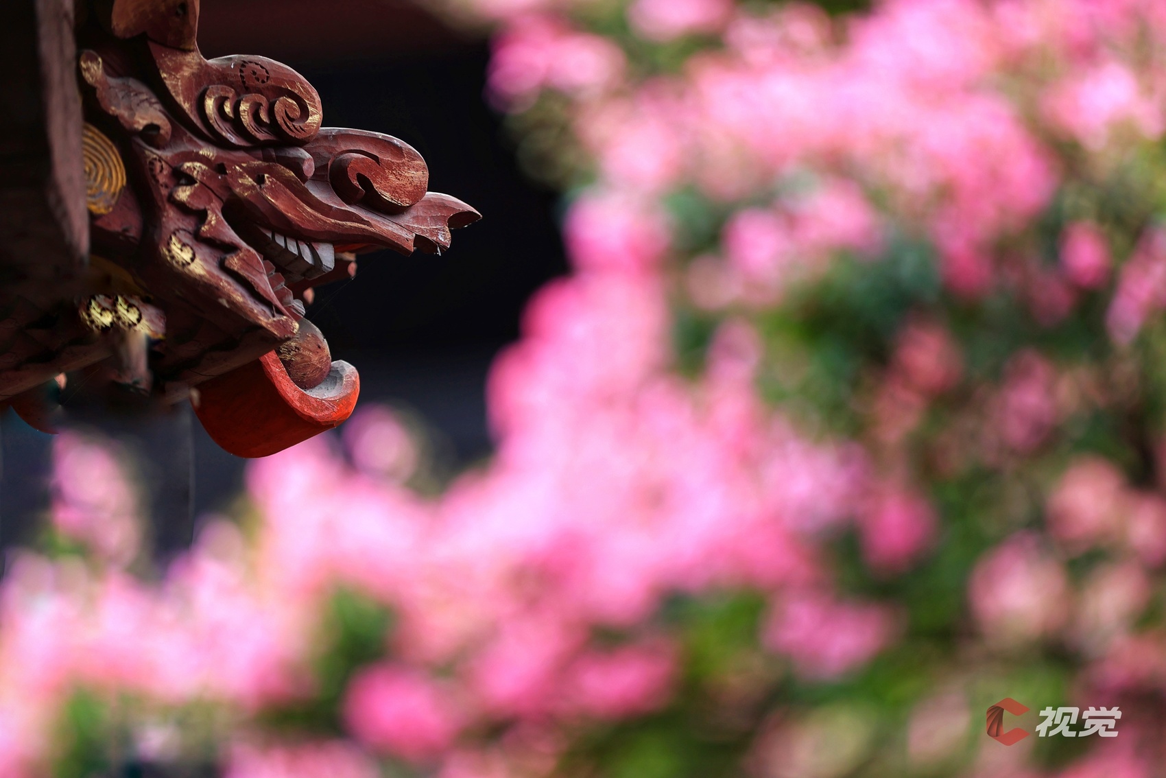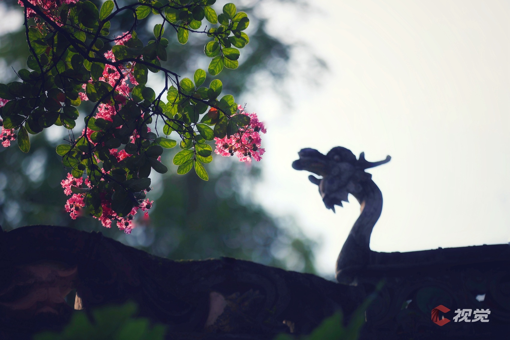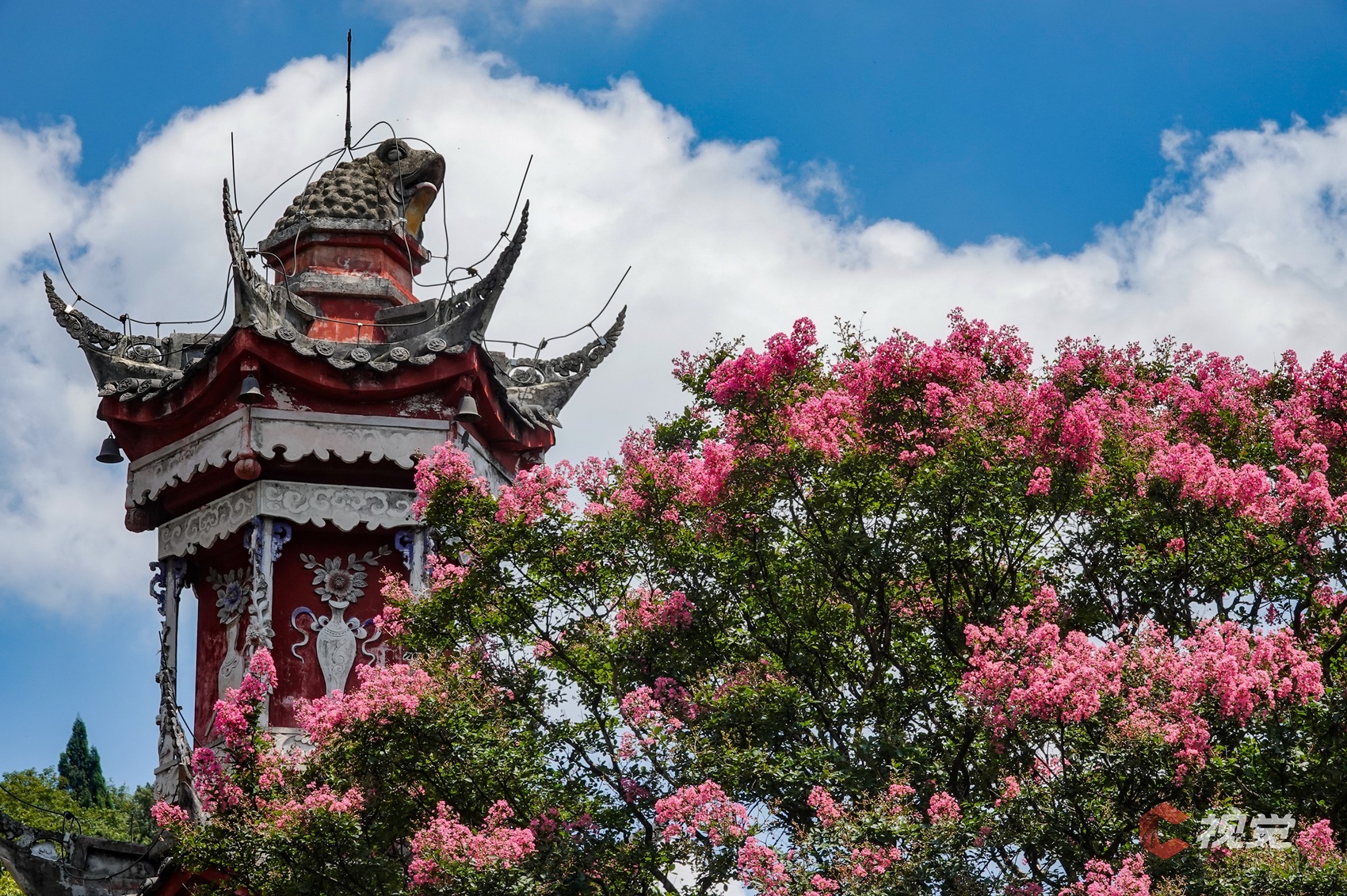 都江堰伏龙观的飞檐上,龙雕与盛开的粉色紫薇花相映成趣。C视觉签约摄影师 罗晓红